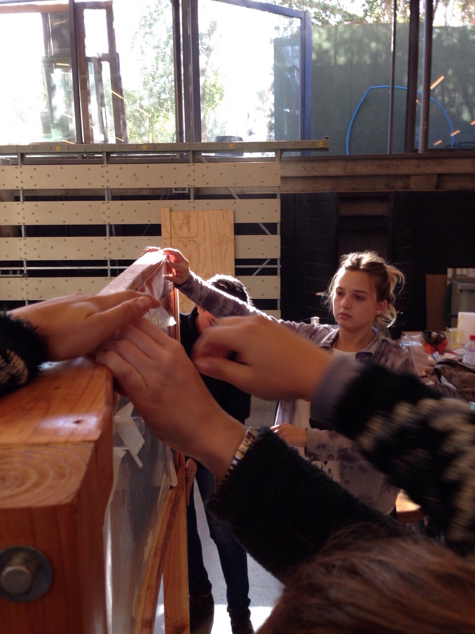 Luego el grupo se dividió en Fernanda Espoueys y Gabriela Godoy, las cuales se quedaron para pegar y redondear los bordes de la parte posterior del prototipo, Florencia Aguirre junto a Isidora Ruiz-Tagle comenzaron a pegar el título en el pedazo de lata para luego éste pegarlo en la estructura de madera, y por último Isidora Pérez con Fernanda Romagnolli salieron del taller para comenzar a rellenar las cajas con cemento.