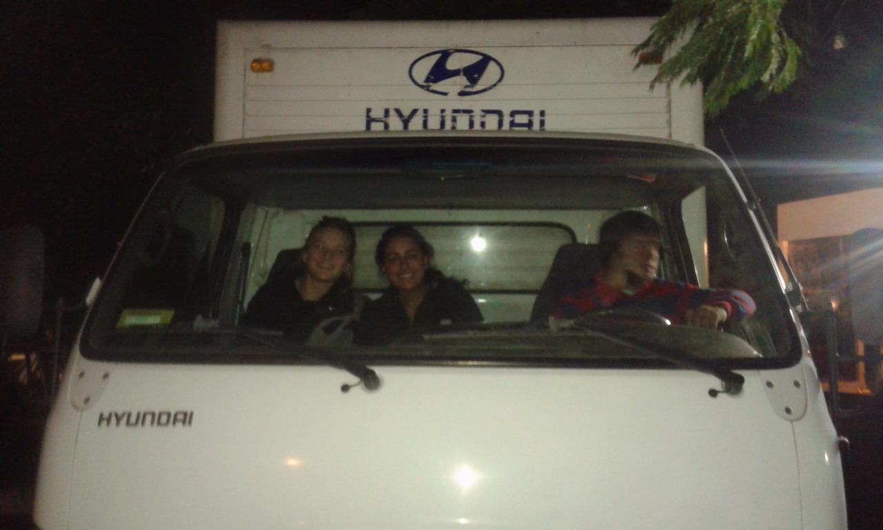 A las 7:30 de la tarde, llega el camión a la universidad, para llevar la estructura y las cajas base al Zoológico Nacional de Chile.
